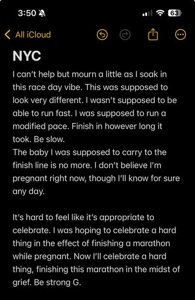 Sometimes I think I should be “over it” by now, but grief is funny that way. The weight still wells up at times and threatens to spill onto everything I touch. Just last week as I sat at the Athlete’s Village prior to running the New York City Marathon, I pulled my sweatshirt hood over my head and wrapped my foil blanket around me as I folded into a ball and wept. I had just written down my goal splits on my hand and it hit me – I wasn’t supposed to be able to run this race this fast. I was supposed to be 6 months pregnant, running a modified race, slow as hell. Every domino suddenly crumbled and I lost myself in a moment of grief, sobbing in a sea of strangers.
